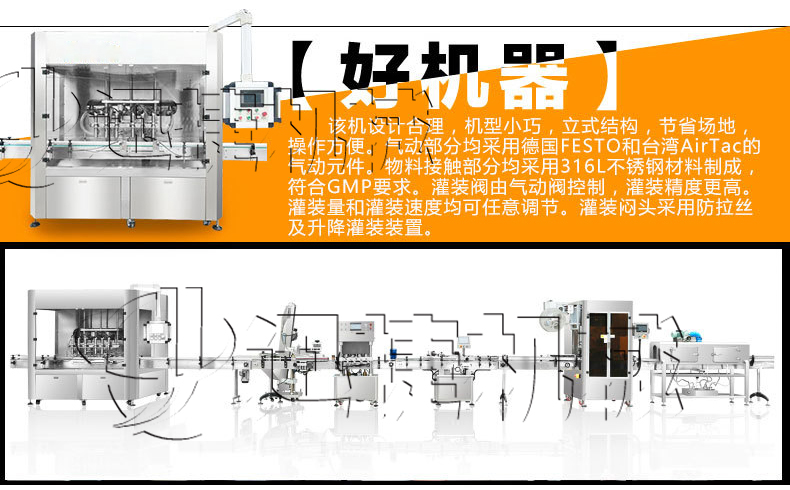 全自動辣椒醬六頭灌裝機作為公司新研發(fā)的灌裝設(shè)備在市場上起到了關(guān)鍵性的作用,是集光,機,電,氣于一體,采用活塞式定量原理,灌裝精度高,操作簡單,維護方便,設(shè)備主要材質(zhì):采用SUS304不銹鋼制造,符合衛(wèi)生要求.灌裝過程采用亞克力透明板與外界隔離,保證灌裝的衛(wèi)生要求。灌裝采用壓力式灌裝,無需配裝高位罐,簡化了安裝工序,提高了灌裝效率??蓮V泛應(yīng)用于食品、醬料行業(yè)產(chǎn)品的自動化包裝生產(chǎn)。
