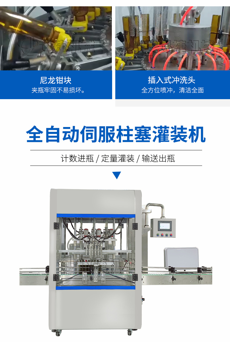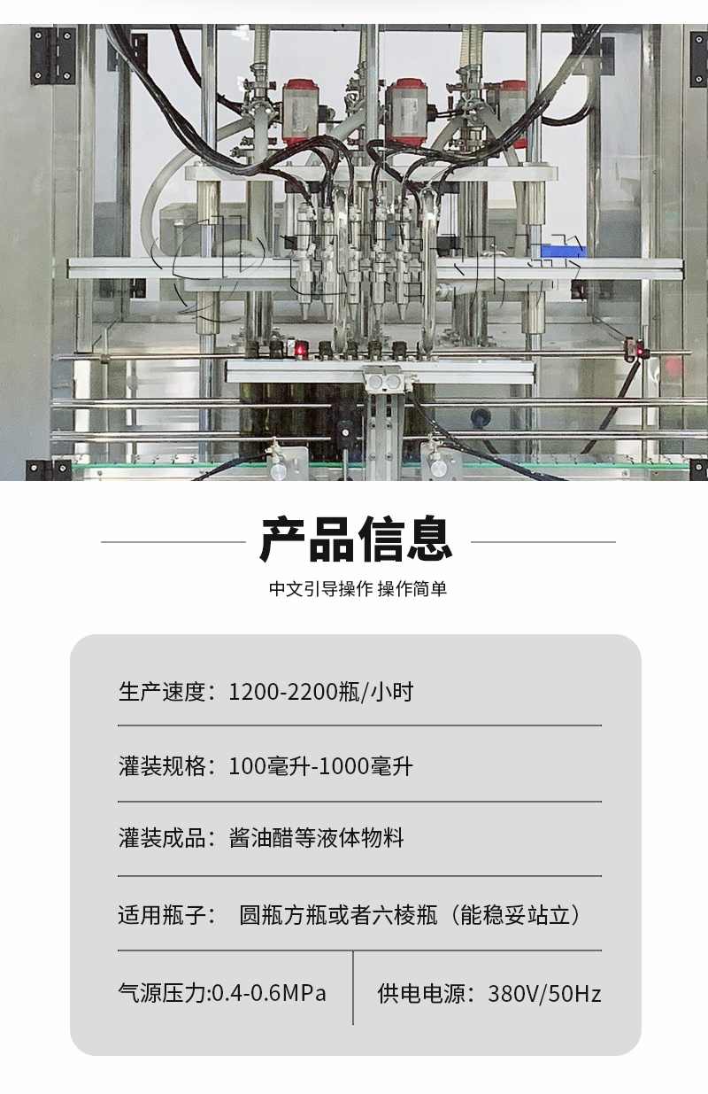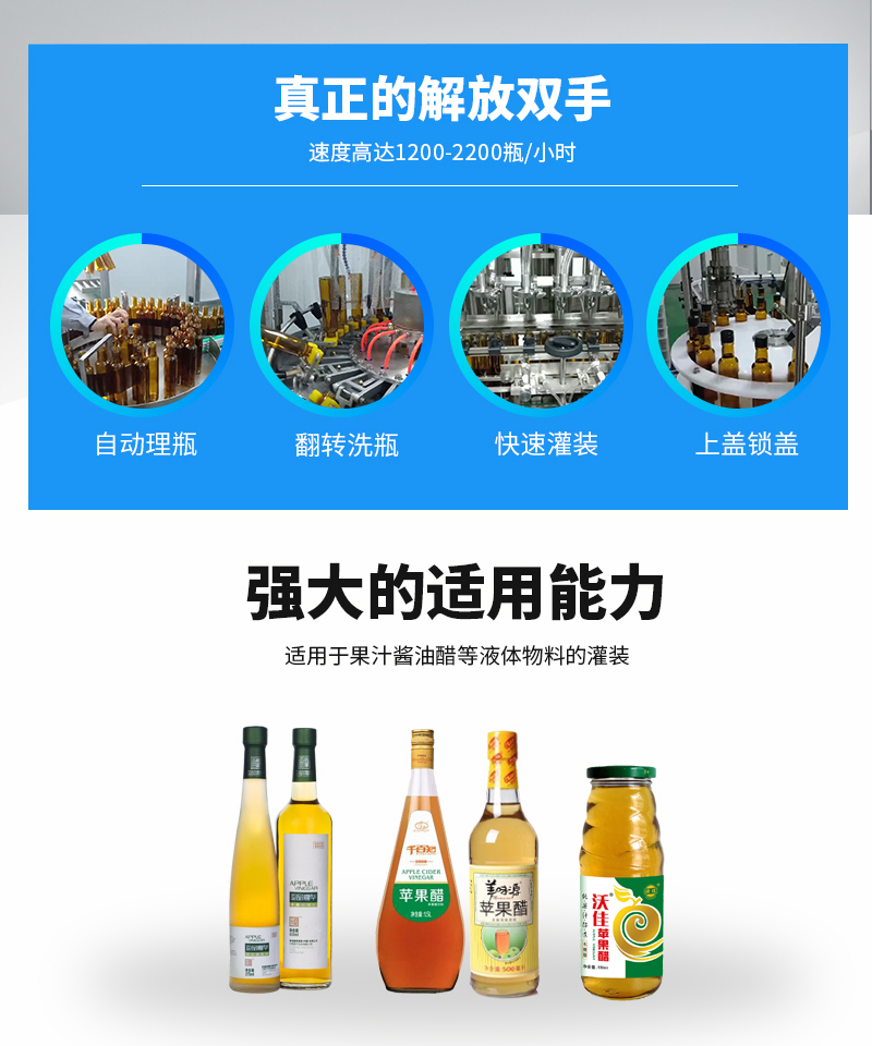 該系列果醋灌裝機采用伺服柱塞式計量灌裝原理,多項專利認證,適用于各種規(guī)格(0.1-1升可兼顧到2升灌裝)的液體灌裝。