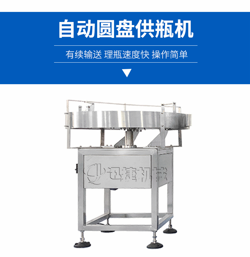 該圓盤供瓶機理瓶機是由人工將瓶子放入圓形轉(zhuǎn)盤上,轉(zhuǎn)盤轉(zhuǎn)動將瓶子有續(xù)撥入輸送帶,進入灌裝機進行灌裝。使用方便,噪音小,理瓶速度快,操作簡單是不可缺少的一個環(huán)節(jié)。