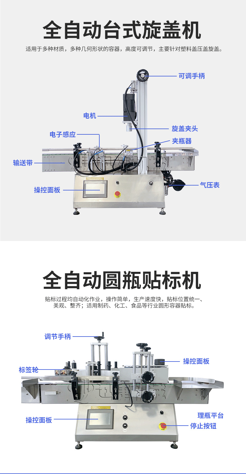 產(chǎn)品說明:桌面型膏液灌裝生產(chǎn)線根據(jù)灌裝范圍選擇型號,灌裝部分為雙頭下潛式灌裝機(jī),適用于不同物料不同瓶子的灌裝,配備自動壓蓋機(jī)和圓瓶貼標(biāo)機(jī),可實(shí)現(xiàn)不同蓋子的旋蓋貼標(biāo)工作。