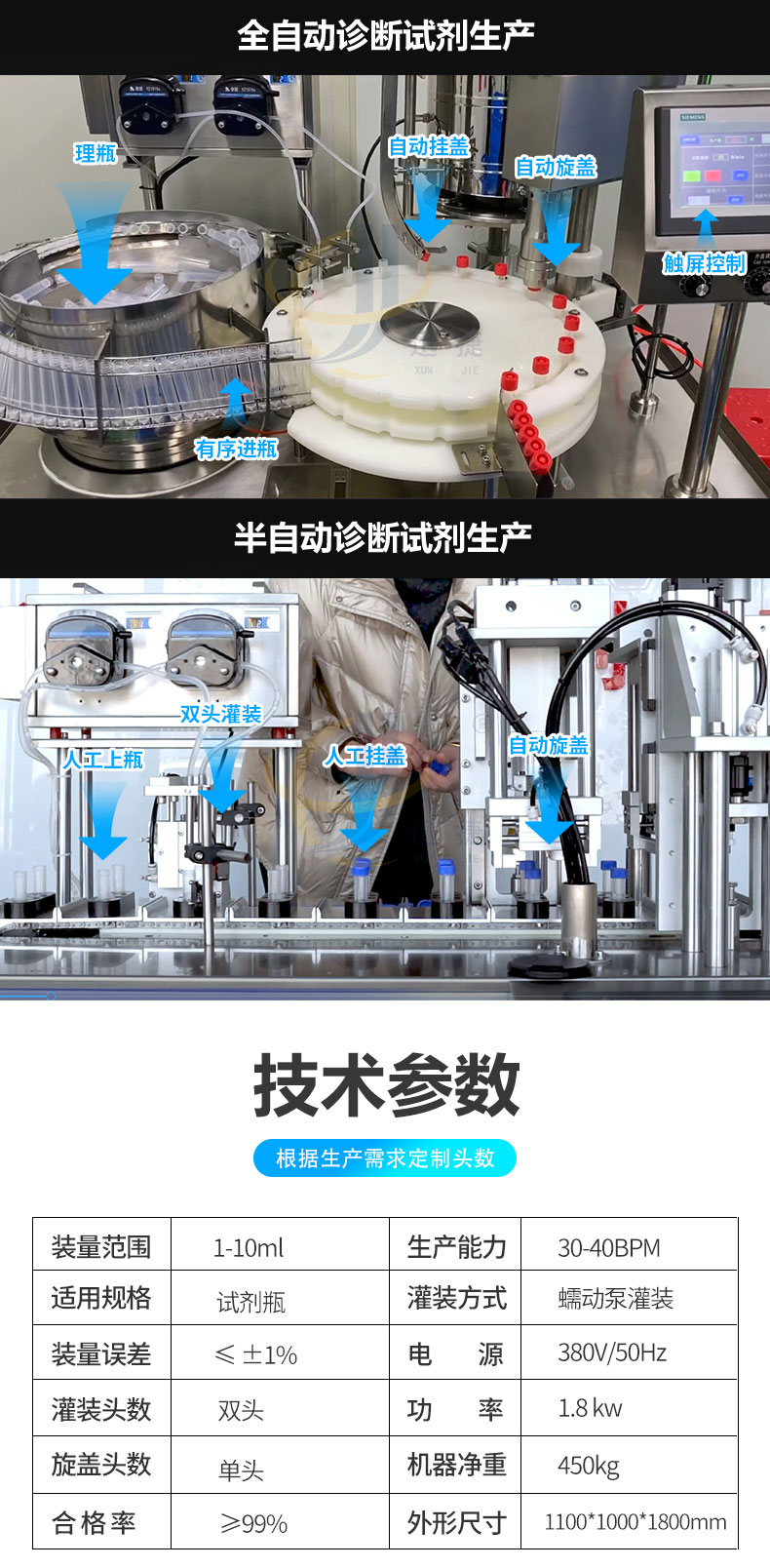 診斷試劑灌裝旋蓋機(jī)適用于診斷試劑、液體采樣管等管狀容器。本機(jī)可選配防塵罩搭配層流罩(FFU)結(jié)構(gòu),可達(dá)到局部百級環(huán)境下完成灌裝及封蓋。