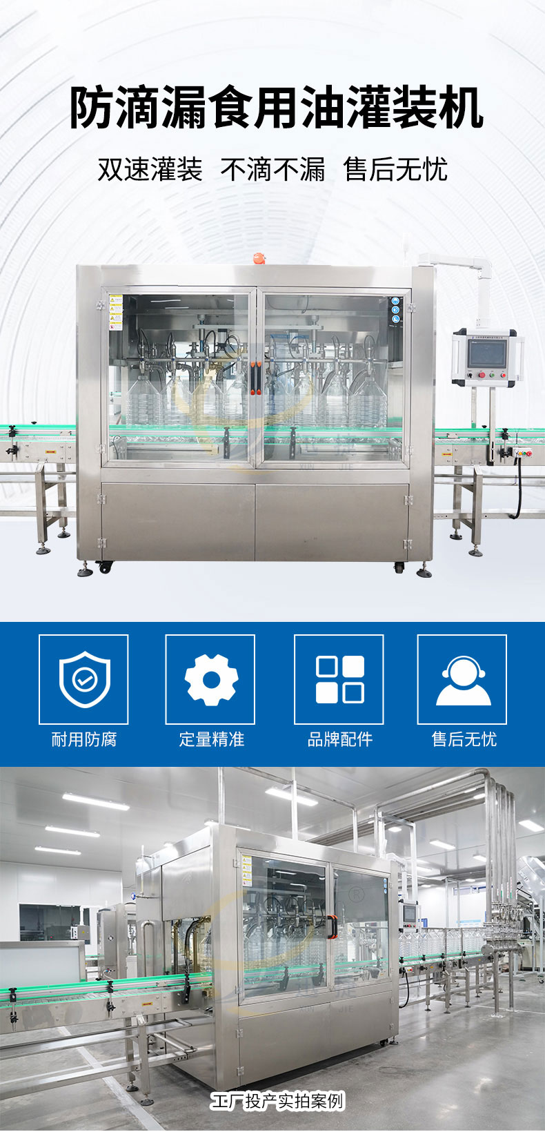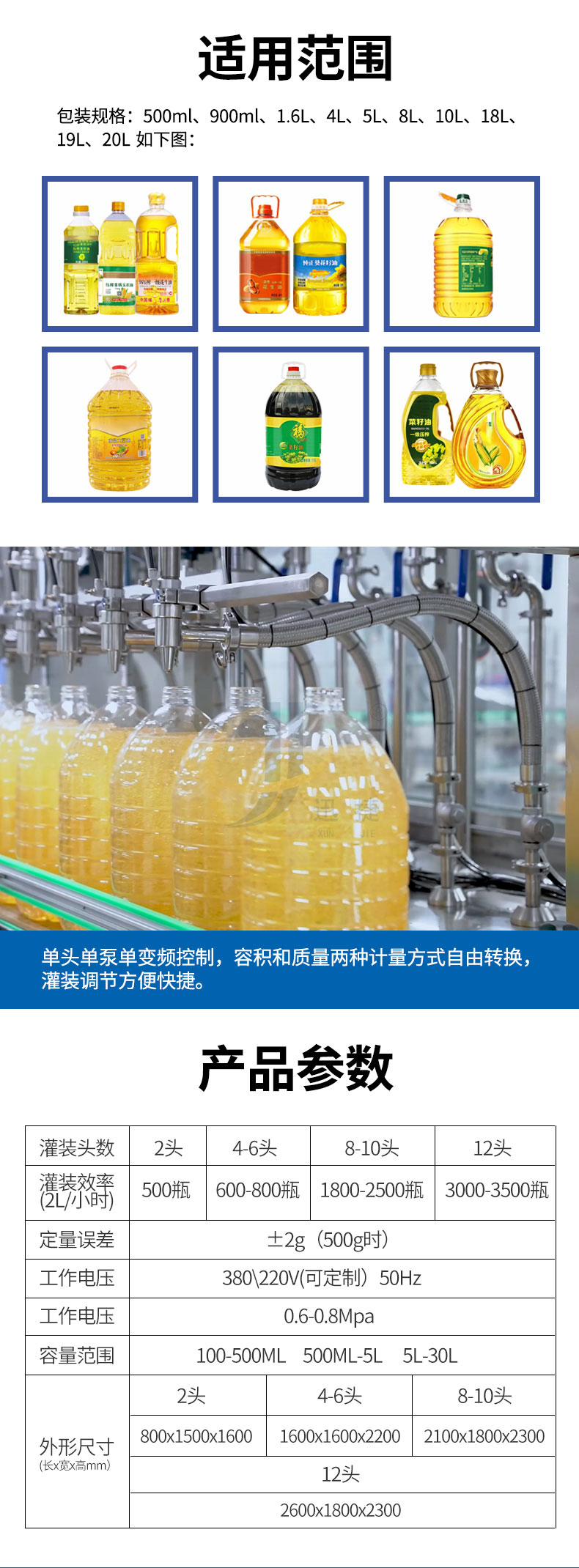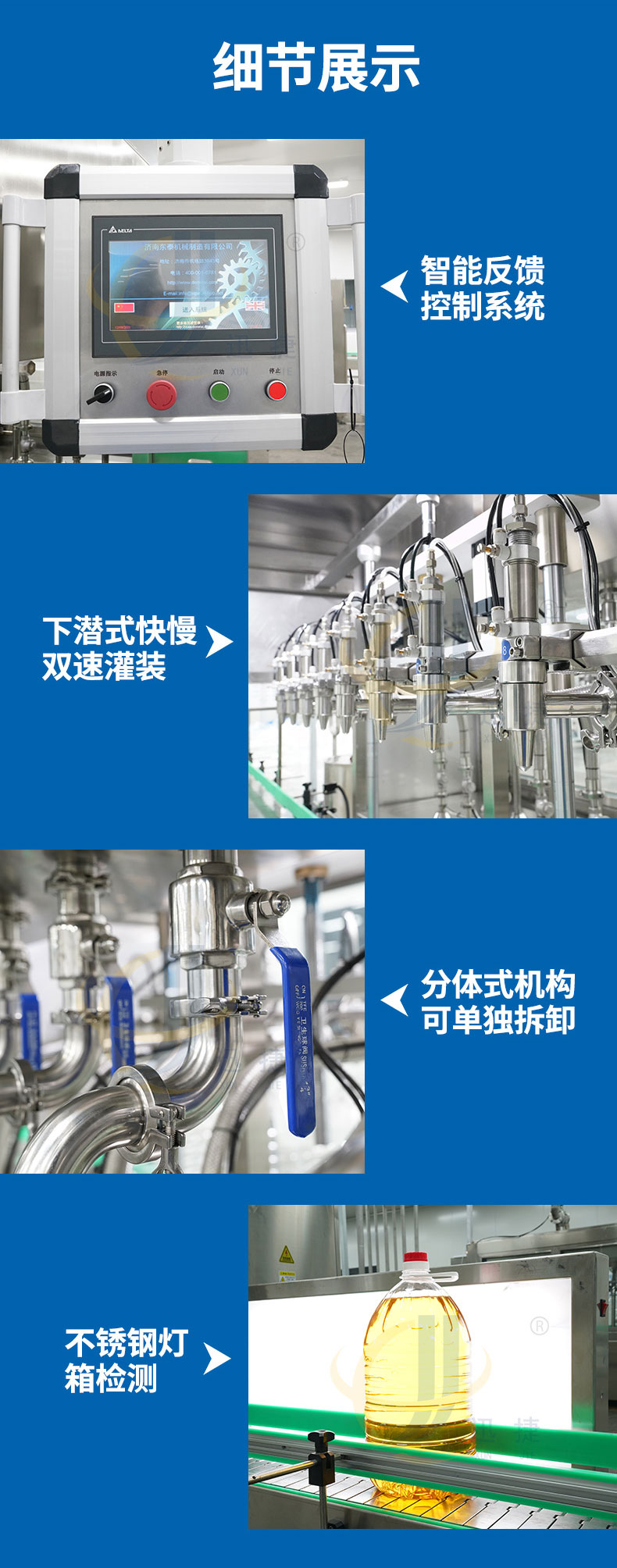 全自動八頭食用油灌裝機(jī)單頭單泵單變頻控制,容積和質(zhì)量兩種計量方式自由轉(zhuǎn)換,灌裝調(diào)節(jié)方便快捷。
