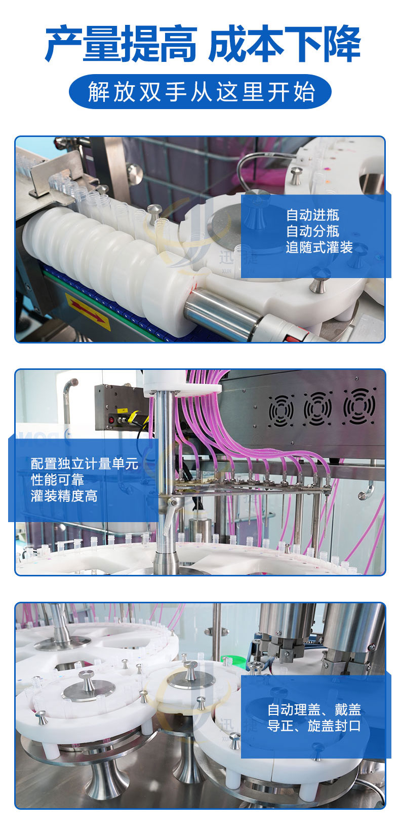全自動(dòng)診斷試劑灌裝旋蓋生產(chǎn)線由理瓶器整理成列,逐個(gè)送入進(jìn)管絞龍,并自動(dòng)進(jìn)入等分盤中,等分盤作不同等分的間歇運(yùn)動(dòng)。