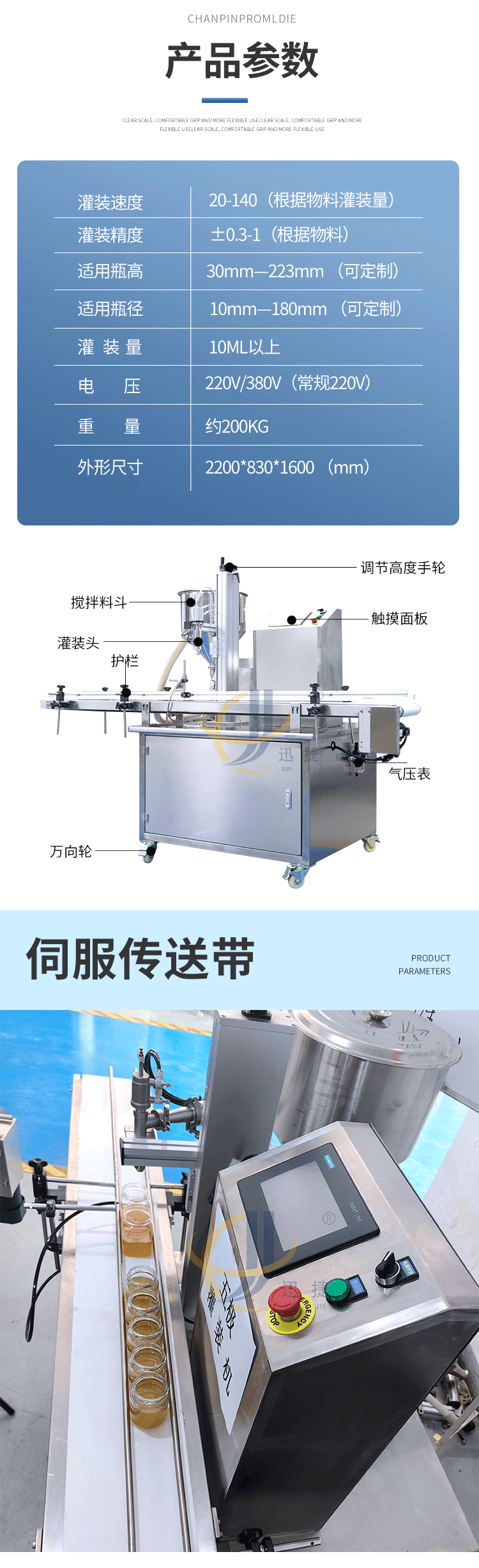 五極灌裝機(jī):極快-單頭2200瓶/時(shí) 極簡-操作簡單 極廣-啥啥都能灌 極穩(wěn)-24小時(shí)不停機(jī) 極準(zhǔn)-200g誤差小于1g。它可以和真空旋蓋機(jī)搭配使用。