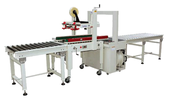 封箱機(jī)(紙箱膠帶封口)+高解析噴碼機(jī)(日期、批號、廠名等信息噴印打碼設(shè)備)+自動打包機(jī)(自動打出兩道PP帶。進(jìn)行紙箱捆扎包裝)